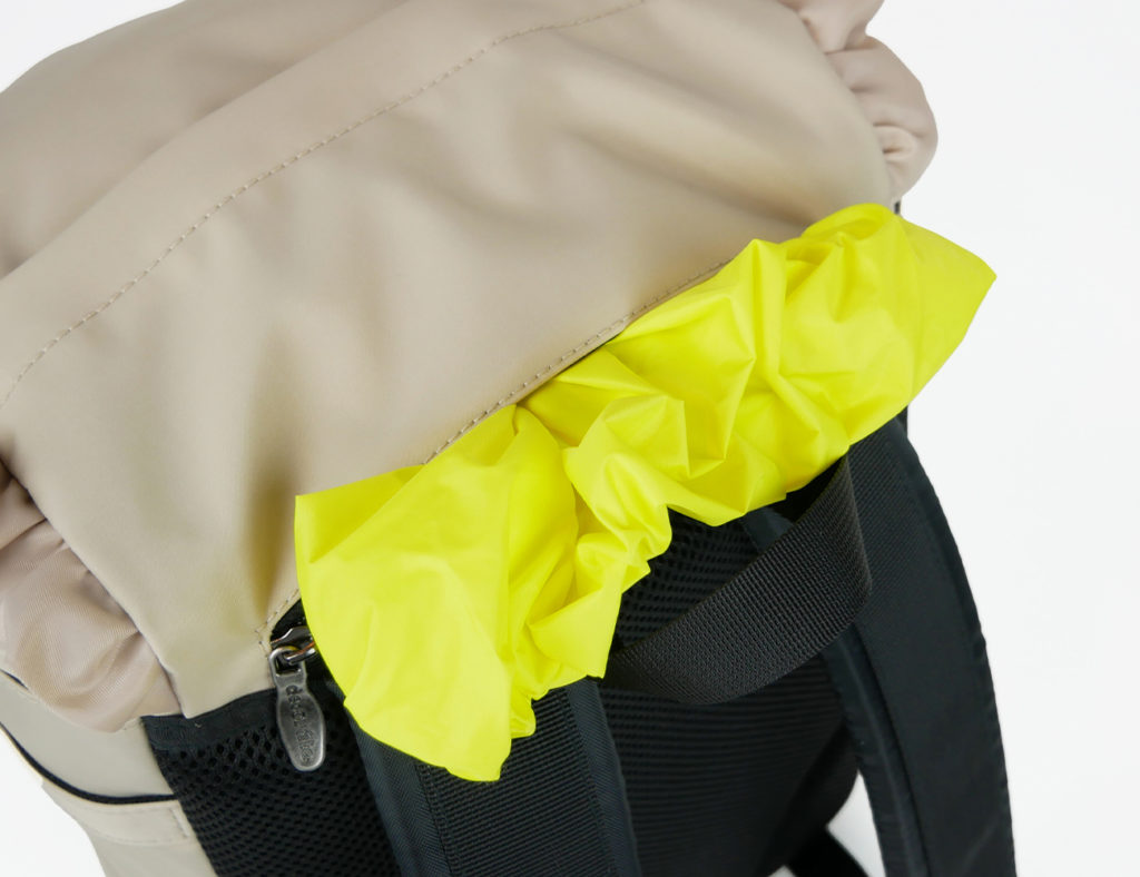 また、メインフラップには収納式のレインカバーを内蔵。ファスナーから引き出してそのまますっぽりと全体に被せるだけなので、急な荒天でも安心です。