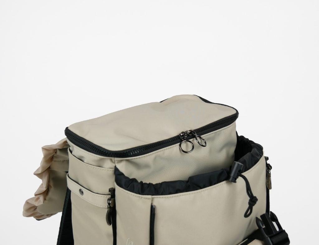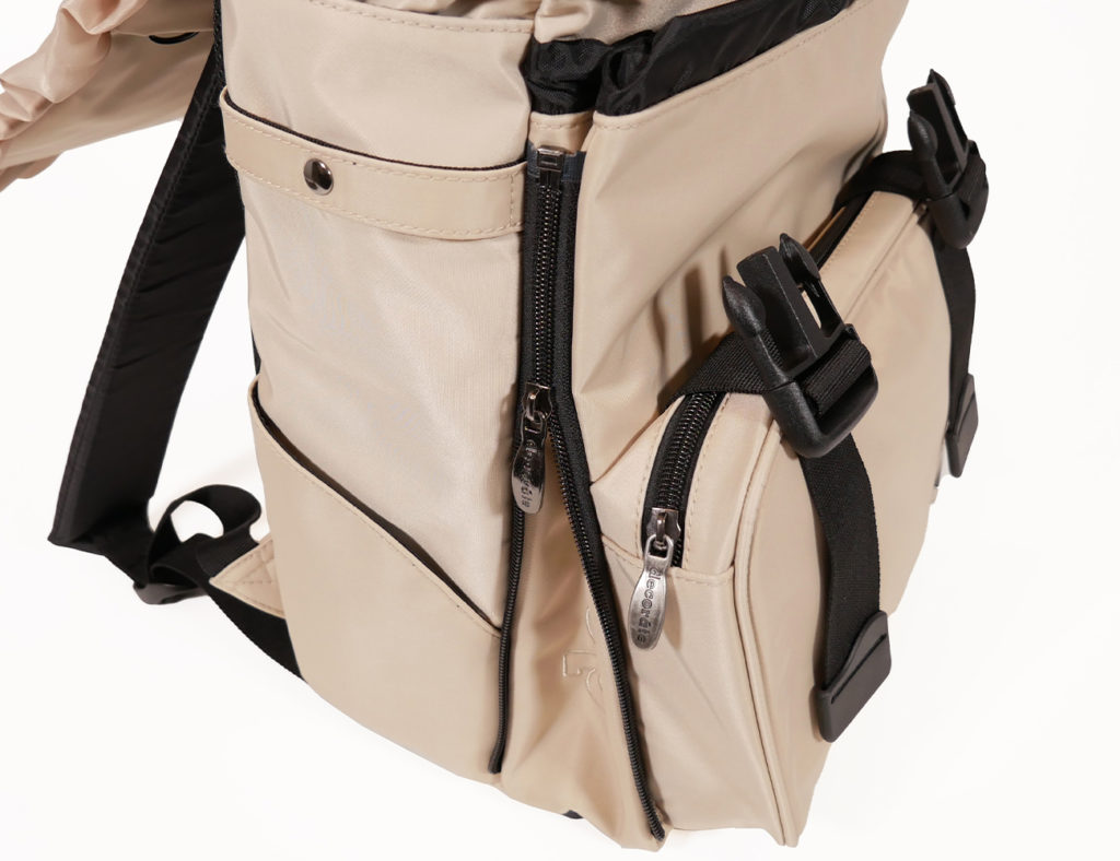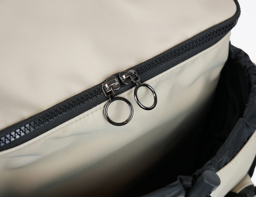 こちらはファスナーでコンパートメントの奥行きを詰めたり広げたりできるので、荷物が少ないときにはコンパクトなシルエットで使うことが可能です。