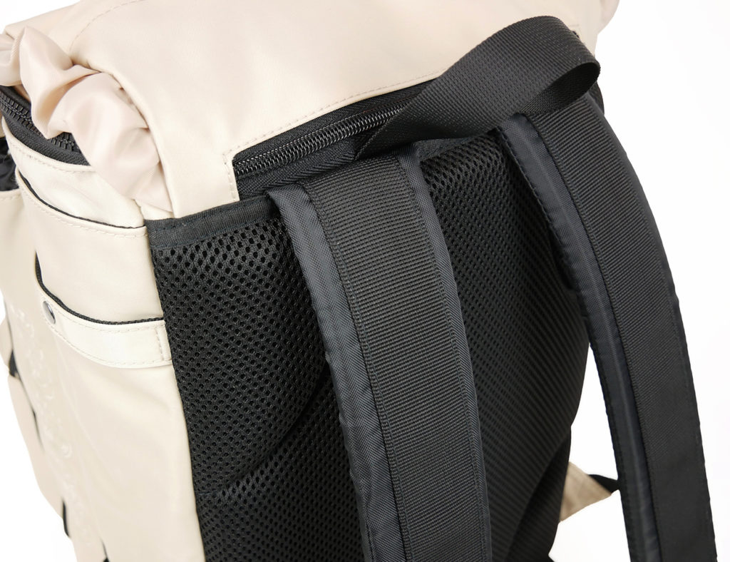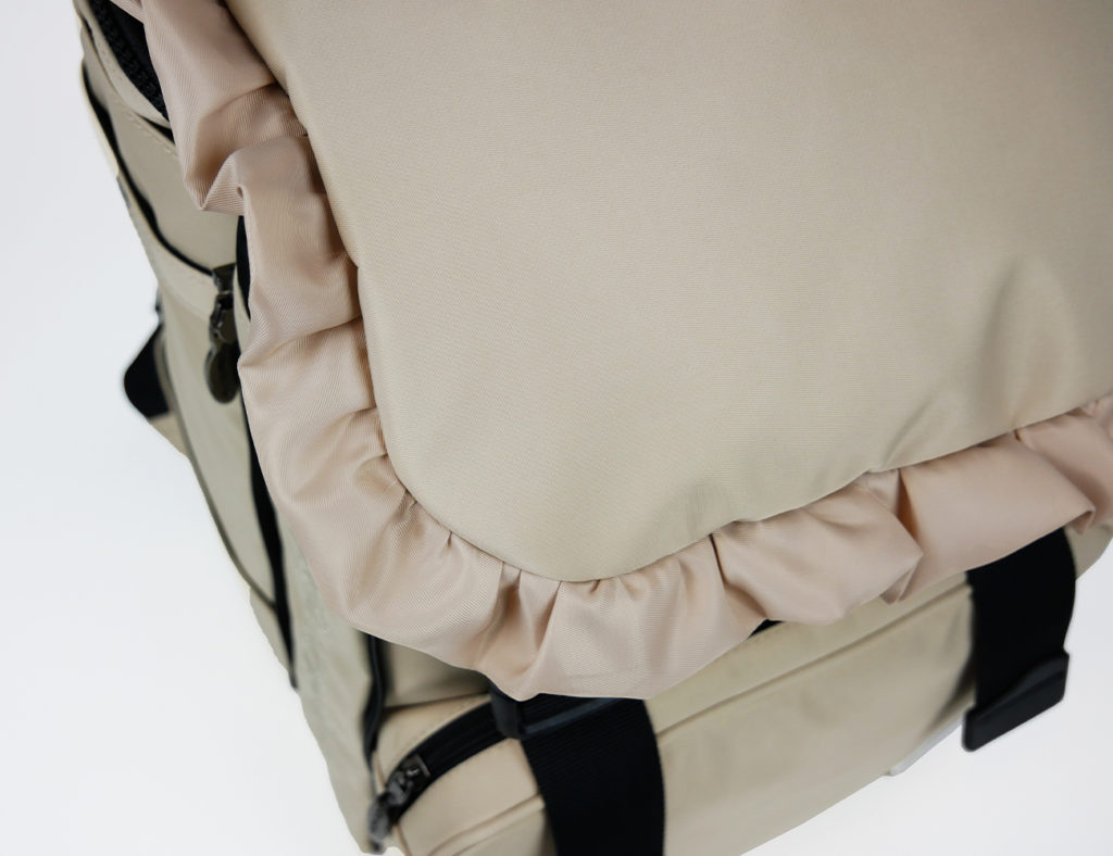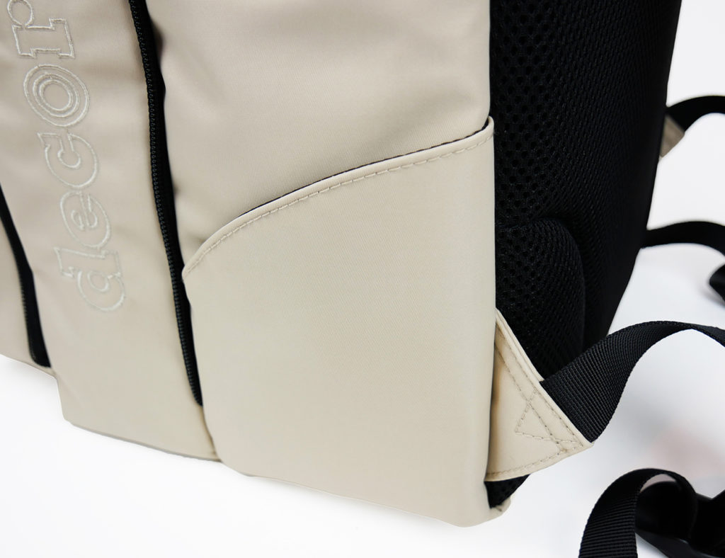 スポーツ・アウトドア的なイメージが強いバックパック型バッグを、キュート&エレガントにデザインしました。外側ポケットに装着したブランドネームのプレートはメタル製で、ちょっぴりリッチな演出も。